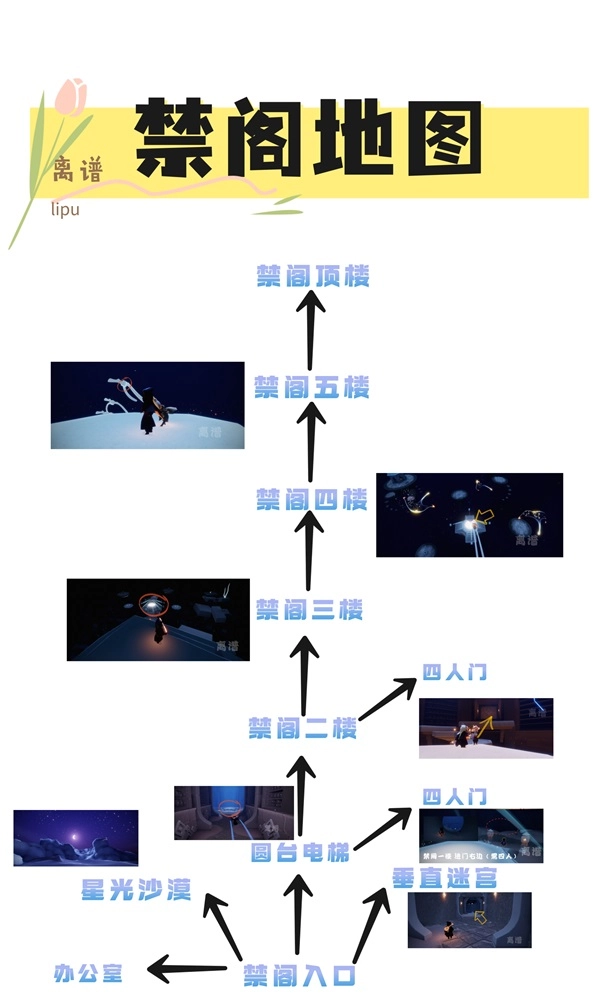 第六个地图是禁阁,它的整体环境和墓土比较相似,都偏昏暗。禁阁总共有6层,每一层都得先点灯,然后在圆台打坐才能前往下一层,而且只能往上走,没法往下返回。不少玩家觉得禁阁难走,但只要摸清楚每层的特点,其实走起来也挺顺利的。禁阁还有个附属地图叫星光沙漠,那里的环境真的绝了,既能看月亮,也能和CP贴贴、挂机,体验特别好。