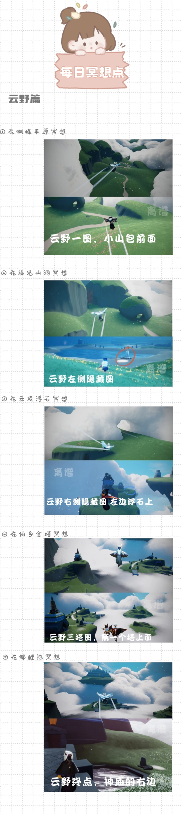 我们能在每日任务里看到冥想点的地点名称,却不清楚具体位置,离谱为大家整理了各张地图的冥想点。