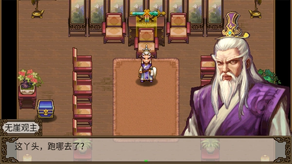 婉青正和无涯观主说着话,礼师兄突然急匆匆地闯进来禀报:道德宗的慕云峰已经打上无涯观了,非要他们交出那位白衣妖女不可。无涯观主心中一沉,知道观里怕是要大难临头,连忙吩咐婉青带着索星石从后山的密道逃走。就在这时,你接到了第一个主线任务——师命难违。等无涯观主离开后,通往无涯后山的密道便打开了。接下来你要操控婉青(注意看人物头上的红色箭头,它会指向完成任务的地方),沿着密道向上走,从出口离开就好。