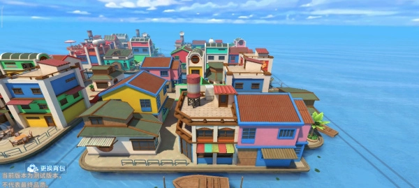 大家都清楚,小丑风格的地图往往以明亮的橘色为主色调,地图中央的四栋大房子主要呈现的色彩也是橘色,房子之间形成了一个十字路口,大地图的两侧则是两条宽敞的街道。几棵椰树与一辆小车作为点缀,显得十分得体。