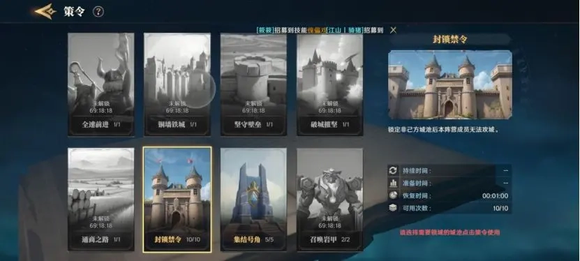 阵营君主能够对即将攻打目标城池使用策令中的“封锁禁令”,如此一来,就无需担忧阵营成员提前接触该城池的情况了。