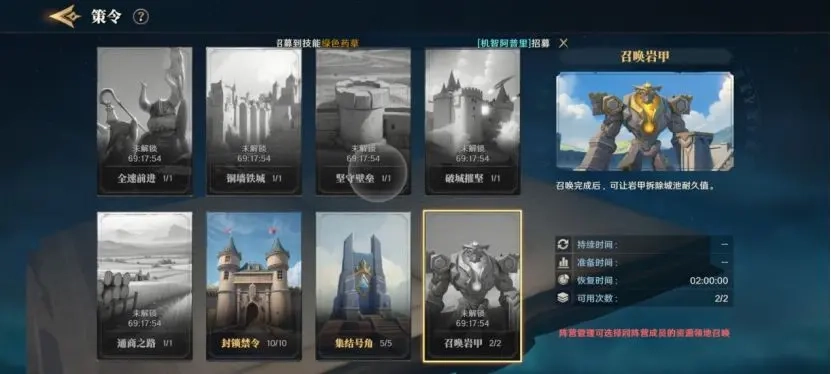 四、后续在攻打城池的阵营中,君主还能运用策令里的“召唤岩甲”技能。岩甲的攻城值十分出色,可专门用于攻城作战。