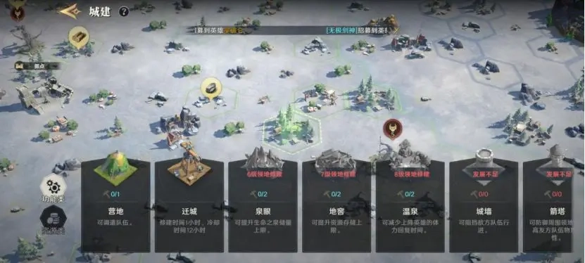 七、阵营攻占城市后,该区域内的土地可不受链接限制直接攻占。因此前期建议尽量迁城至低级城附近,这样更利于发育——只需攻占一块地并修建迁城建筑,就能完成迁城操作。