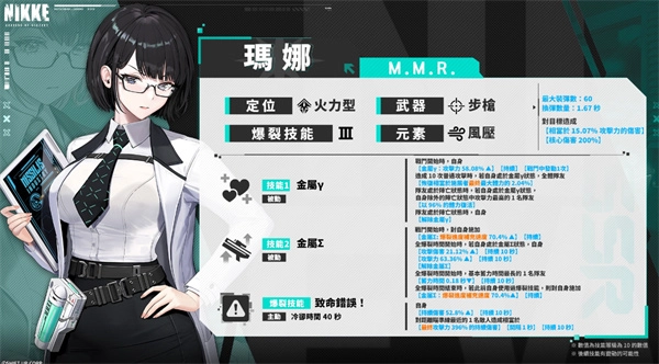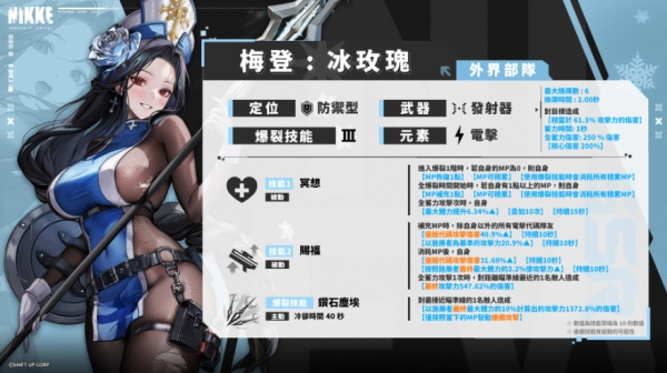 梅登:冰玫瑰消耗MP能够强化自身的攻击能力。补充MP时,除自身外的所有电击代码队友都能获得增益效果。当使用爆烈技能时,会耗尽所有MP,并对单个敌人造成与消耗MP量成正比的高额伤害。