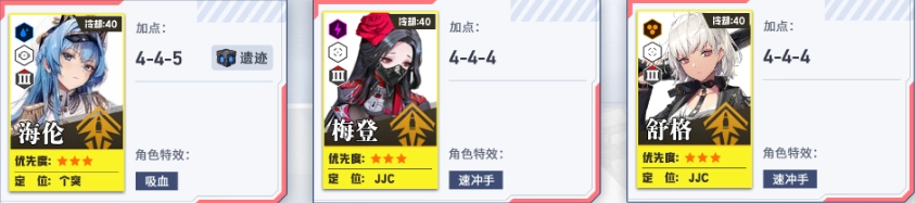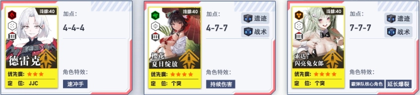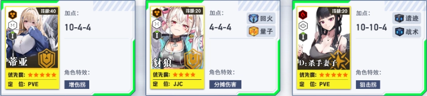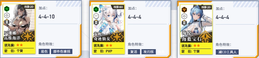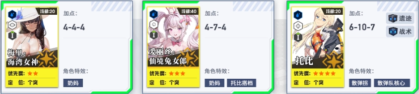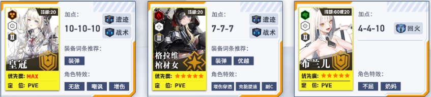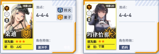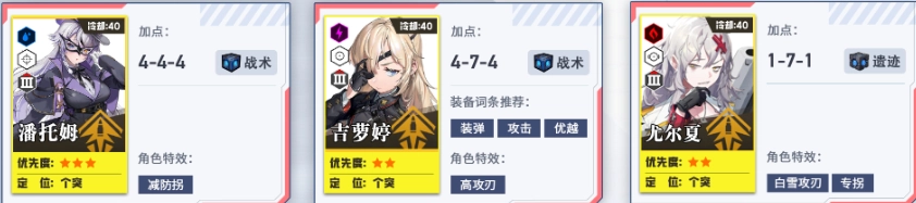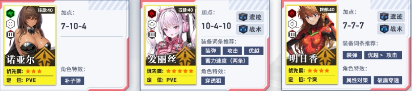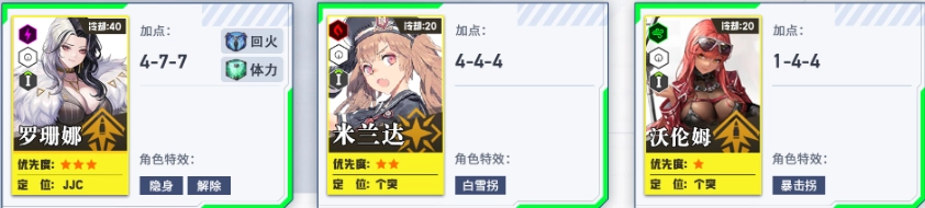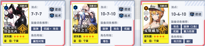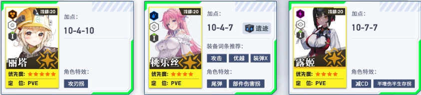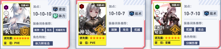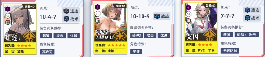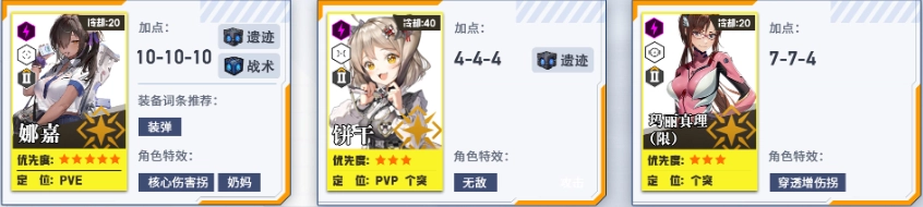 培养第二、第三梯队,为个人拦截战做准备。其中火力型角色的头、胸、手属性拉满,脚部保持1级即可。