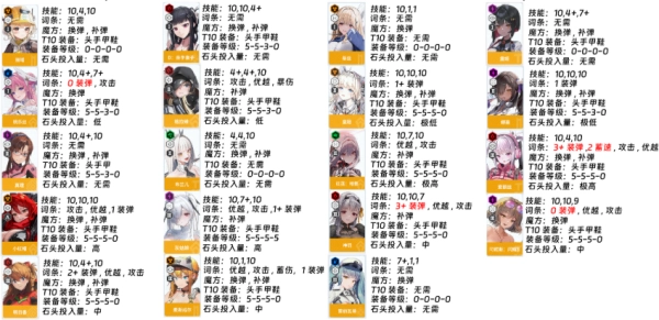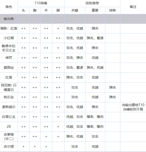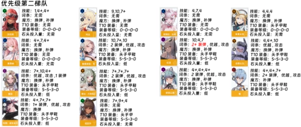 主线的5名角色,所有装备先提升到T10等级;其中火力型角色的每个装备部位都要达到T10满级,其他类型的角色装备到T10后只需保持1级即可。