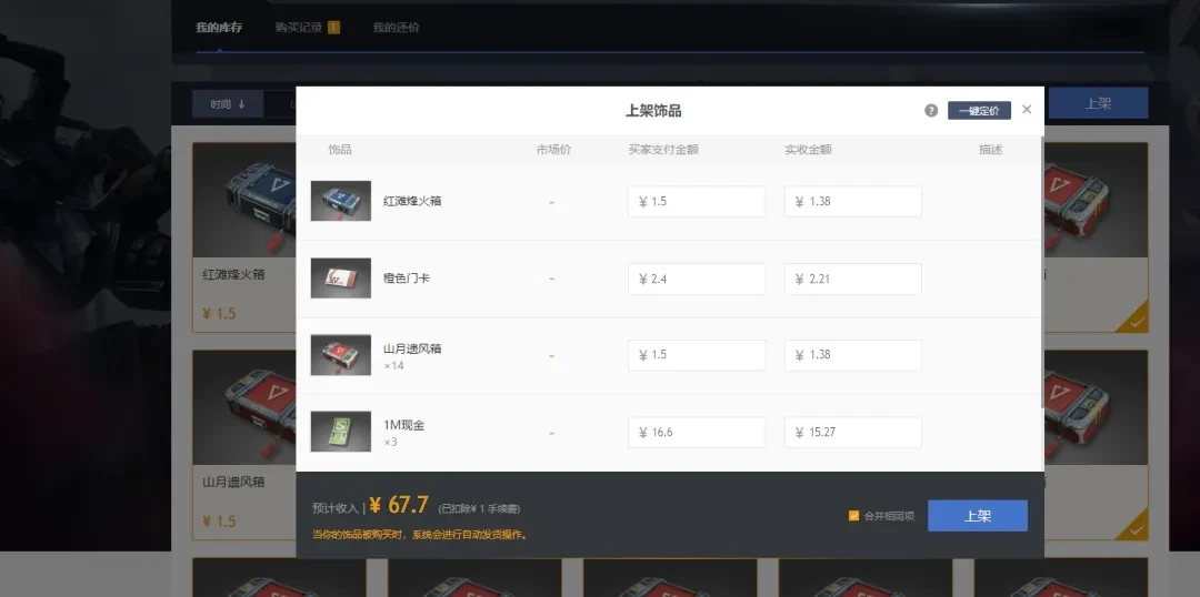 在游戏里通过售卖物资攒下游戏货币,或者拿到稀有道具后,咱们就能去【拍卖行】的寄存柜办理【寄存】手续。等物品顺利寄存好,就能在藏宝阁和BUFF交易平台的【库存】界面完成上架操作。一旦上架的物品被买家买走,实际的收益就会自动打进咱们的平台账户里,一杯奶茶钱就这么轻松赚到啦~