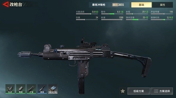 暴雨冲锋枪搭配精准枪托(侧肋贴合词条)、红点瞄准镜、制退器与扩容弹夹