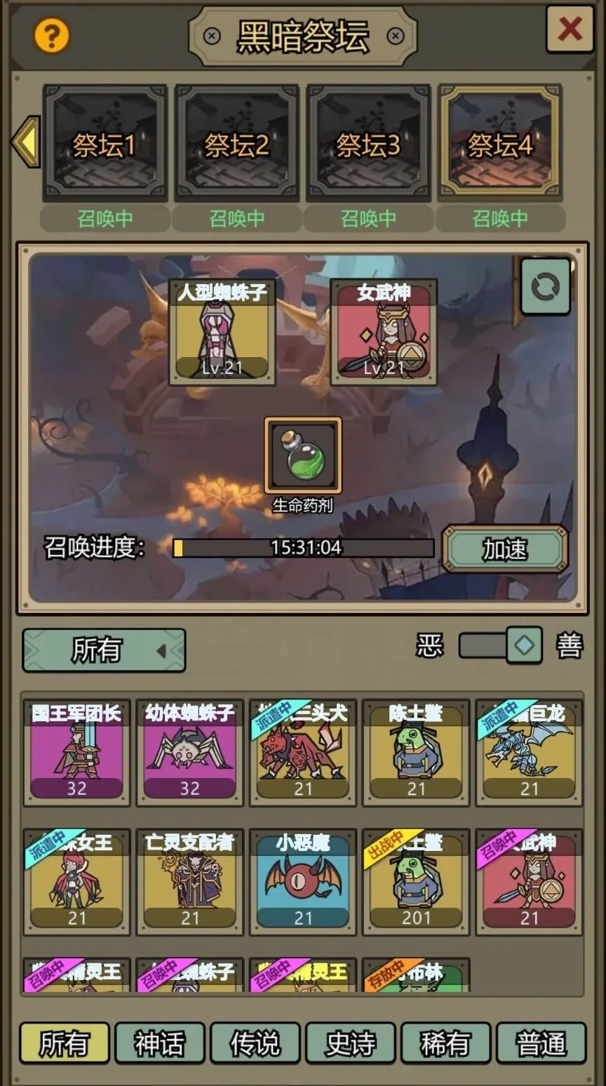 想要通过黑暗祭坛“生娃”的话,可以这样操作:先集中资源重点培养一个核心英雄,精灵王或者矮人王都可以,再搭配几个不太重要的“酱油”英雄上阵,一路推图到110关就能解锁黑暗祭坛了。 黑暗祭坛的用法是把一个恶阵营英雄和一个善阵营英雄放一起,经过16小时(看广告能加速到8小时),就能生出一个和恶阵营英雄同类型的新英雄——划重点,生出来的“娃”和恶英雄是一样的,谁是恶方就生谁;新英雄的成长属性会随机继承善英雄的品质,还有概率出现变异属性(如果两个参与生育的英雄都带变异属性,出变异的几率会更高)。 需要注意的是,每个英雄的善恶阵营在获得时就随机固定了,而且他们能参与生育的次数也是固定的,恶英雄的生育次数范围是0到3次,每参与一次生育次数就减少一次。所以如果抽到一个生育次数为3的恶英雄,就能用它生出3个和自己一样的英雄;而且生出来的英雄通常比直接抽到的品质更好,新英雄也会自带善恶属性。 后来游戏还加了各种药水系统来稳定生育结果,比如放恶药水的话,生出来的就必定是恶阵营英雄,这样就能实现“恶生恶、恶再生恶”的循环,子子孙孙一直延续下去。运气好的话,抽一个英雄就能靠生育发展出一整个家族,甚至直接把这个英雄升满星。这么看的话,开局能抽到一个恶英雄,真的能省不少心呢。