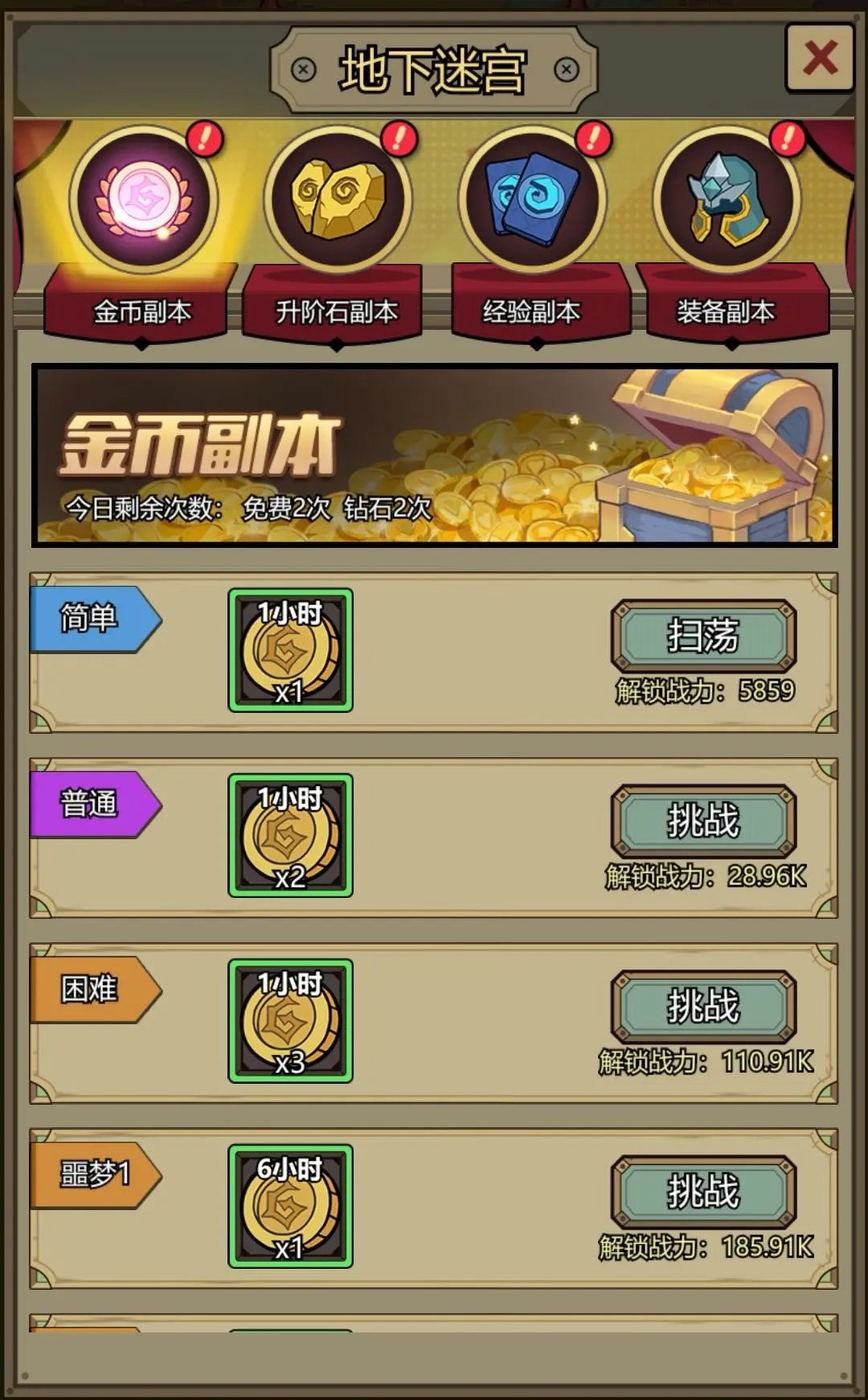 地下迷宫这个副本包含四个小副本。在170关之前,玩家还能通过它获取一些金币和经验;但到了170关之后,金币就不再短缺,经验也主要依靠酒馆来获取了。至于升阶石和升星石,因为有至尊宝箱的存在,基本也不会缺乏,所以这部分奖励没什么用处。而装备方面,奖励的价值太低,基本可以忽略不计。综合来看,地下迷宫就是个可有可无的副本,170关之后不值得玩家花费钻石在上面。