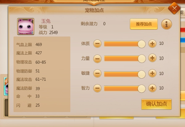 宠物升级时会获得潜力点,这些潜力点能够由玩家手动分配到宠物的各项基础属性上。