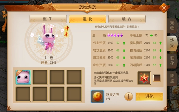 宠物进化可按百分比提升各项资质。