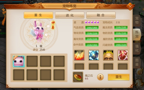 使用魄之石对宠物进行重生操作后,宠物的强化效果与属性都会被清除。