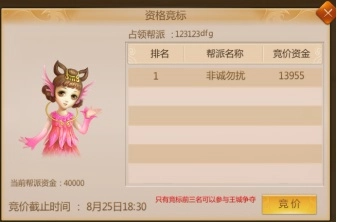 在非王城争夺时段,各帮派的帮主及副帮主可参与王城争夺资格的竞标。本周六晚间19点30分是竞标截止的最终时间,届时竞价排名前三的帮派将取得王城争夺资格,成为攻城方;上一周占据王城的帮派则担任守城方。