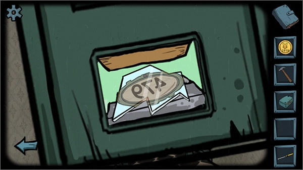 然后回到二十年前,留意电视柜上的图案:圆形包围着三角形,由此可知圆形大于三角形;三角形包裹着长方形,所以三角形大于长方形;长方形又包裹着正方形,因此长方形大于正方形。据此设定数值:圆形对应22,三角形对应19,长方形对应5,正方形对应1。接着将这些数字转换成对应的英文字母,得到“SAVE”,最后在电视机旁的盒子上输入这个结果。