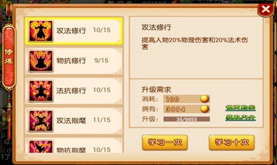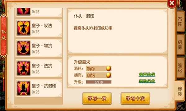 提升修炼层次,能够增强人物、仆从以及皇子的攻击力与防御力。