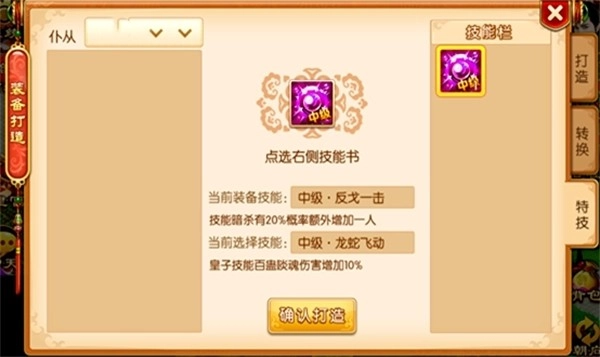 目前仅开放中级特技技能,打造装备时有几率自带中级特技,使用制造石能够提升该概率。