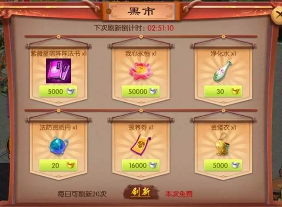 要是当前页面没找到合心意的游戏道具,小主不妨点击下方的刷新按钮,刷新之后就会有新的游戏道具呈现。第一次刷新是免费的,之后再刷新就得消耗元宝啦,而且每位小主每天最多只能刷新20次哦。另外,系统每间隔3个小时也会自动刷新黑市当前页面的游戏道具呢。
