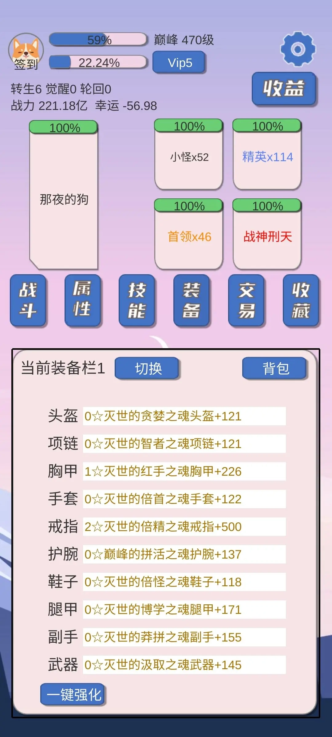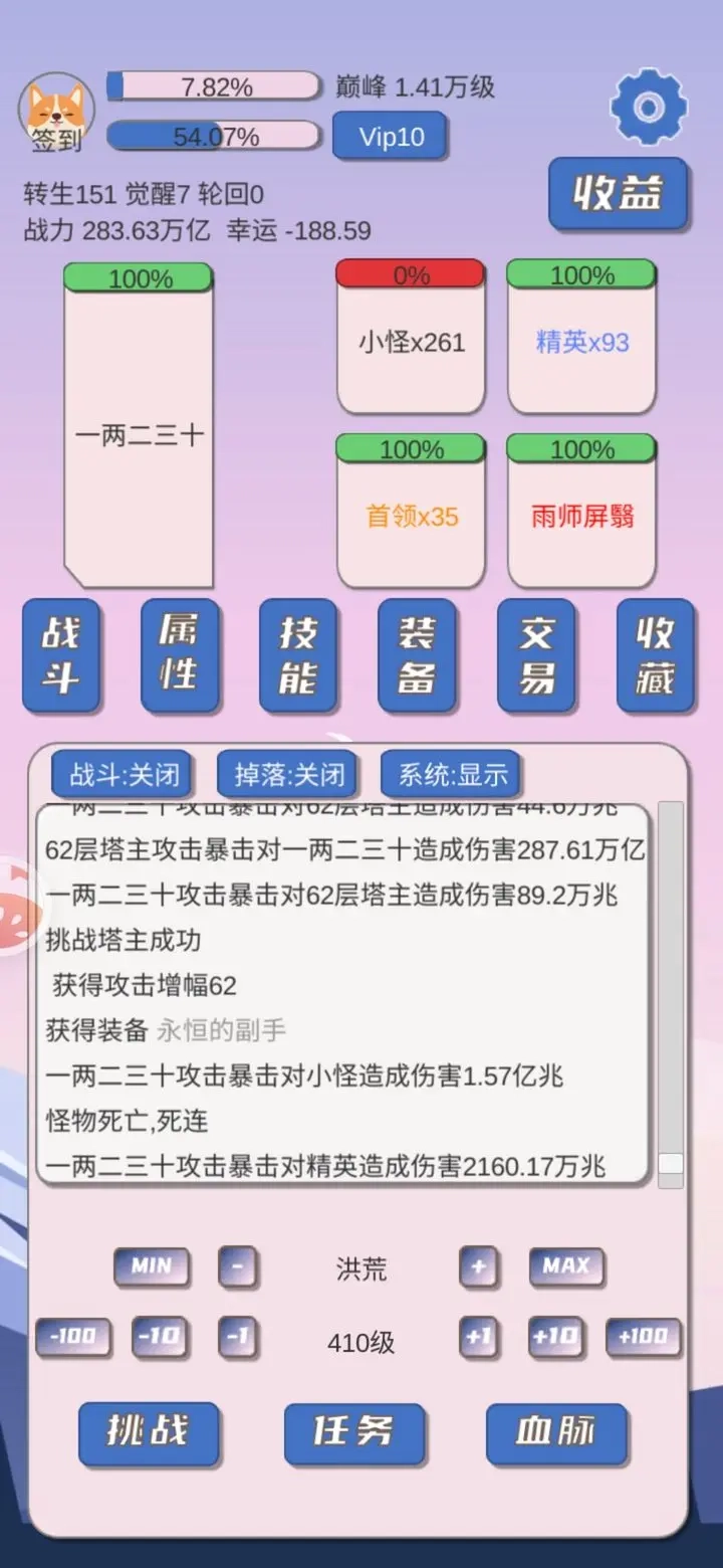 因为飞升后血脉全满10级,收藏也达到了4000,一轮战斗完全是秒过的状态。两轮结束后,就可以开启我们的刷钱之旅了。