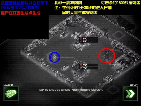 在蓝圈位置部署部队后立刻停下(若部队完成击杀则可继续前进)。