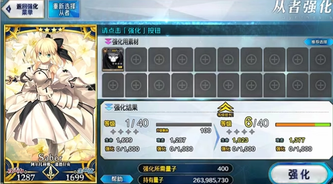 从者能够通过与游戏里获取的「银棋」「金像」之类的强化素材开展合成,以此完成灵基再临(从者进化),从而变得更加强大。