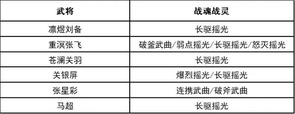 武将名单如下:凛煜刘备(由赵云担任护法)、重溟张飞(护法为关羽)、苍澜关羽(关平担任其护法),此外还有关银屏、张星彩和马超。