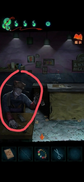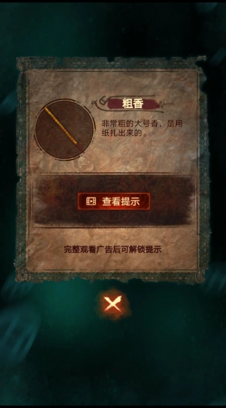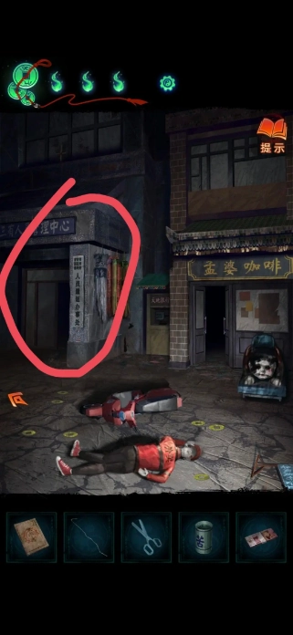 点击牛头雕像,结合咖啡馆玻璃上的提示与马面雕像吊饰的线索进行解谜,成功后可获得粗香;同时,从马面雕像的手中能拿到剪刀。