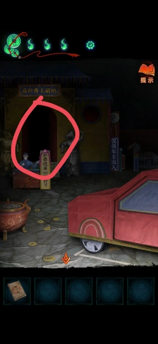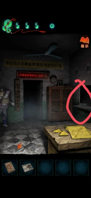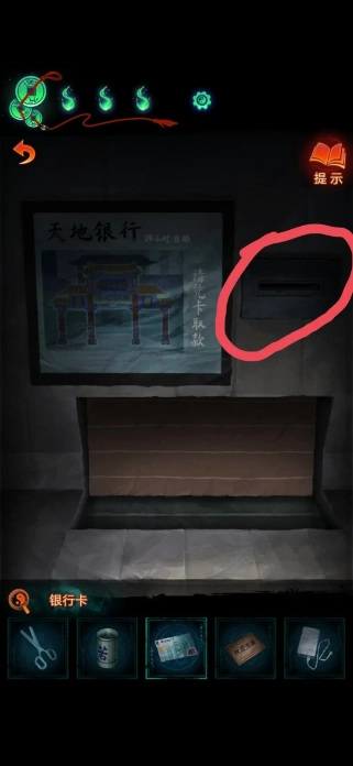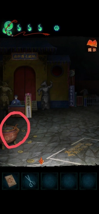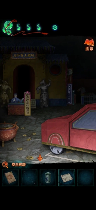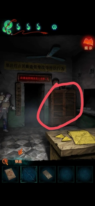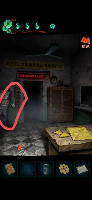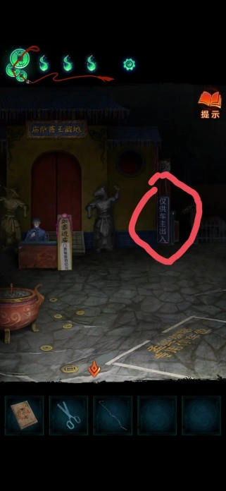 将挂牌悬挂在管理中心的大门上,就能进入了。进去之后,找到桌子上的黄纸,点击它并使用利剪刀完成小游戏(该游戏关联充电宝手机上的线索),即可获得纸钱。