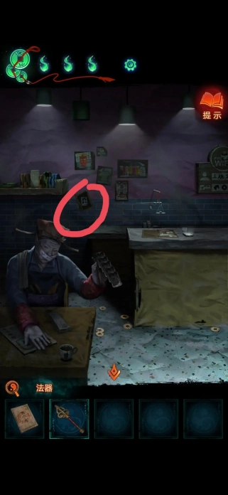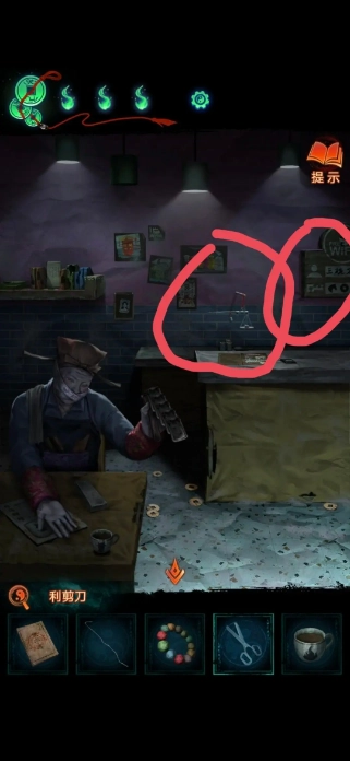 返回咖啡店对墙上照片使用法器和利剪刀获得照片。