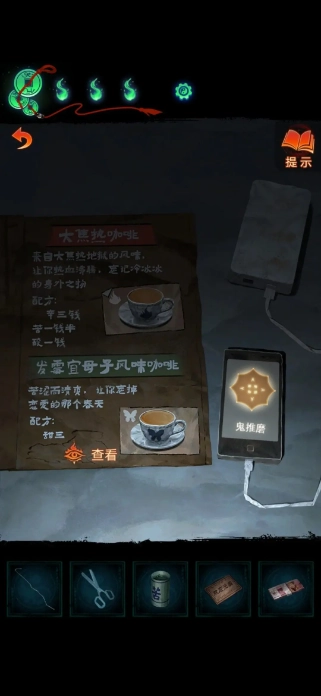 按照桌子上的配方调配咖啡,就能得到道具大焦热咖啡,以及甘味原料和苦味原料(配方是两杯辛、一杯半苦、半杯酸)。之后回到咖啡店外触发剧情,点击墙上的WiFi框即可获得手机。