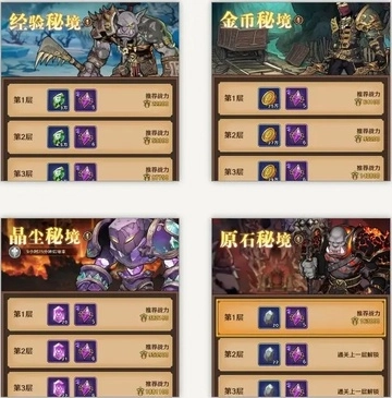 在资源秘境里,经验、金币、晶尘、原石这四大秘境正等待着各位冒险家前来挑战。
