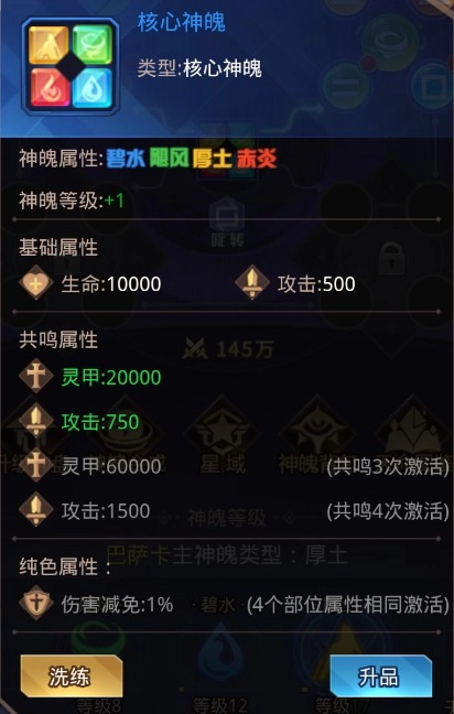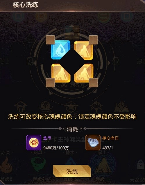 核心神魄能够借助核心命石开展洗练操作,洗练过程会对神魄属性产生改变,一旦4个部分的神魄属性达成一致,纯色属性加成便会被解锁。