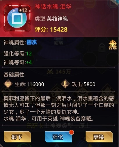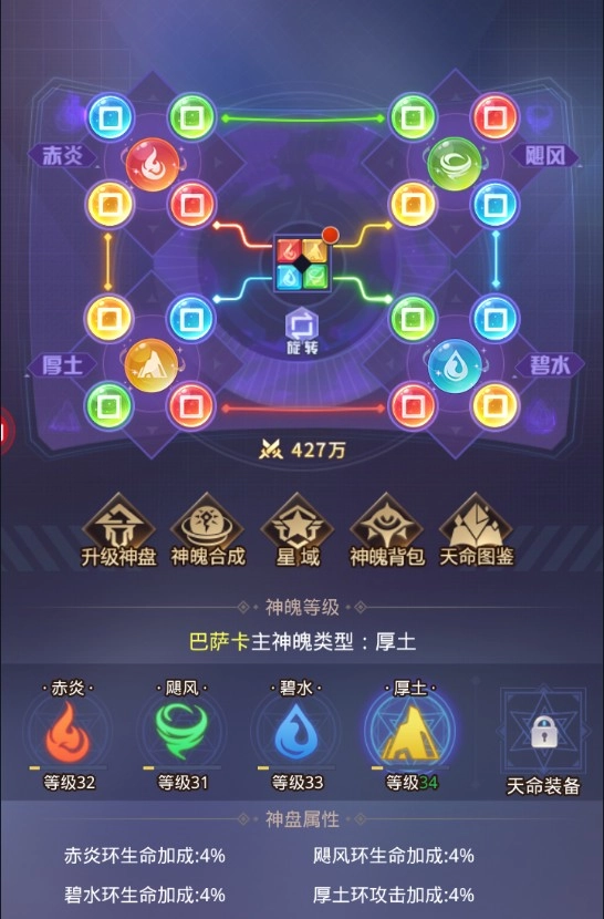 每个英雄都配有专属的神盘,该神盘包含4个神环与1个核心神魄,神环部位能够穿戴神魄装备,一旦穿戴神魄装备,英雄即可获取对应装备的神魄等级。
