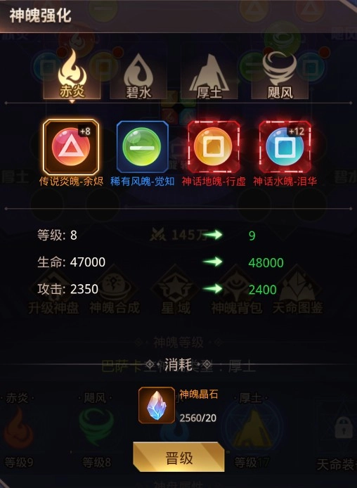 消耗英雄本体与神盘能量结晶能够对神盘进行升级,升级之后神环会获得生命和攻击方面的加成。