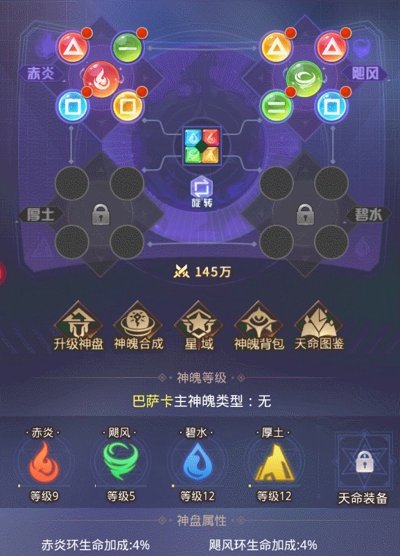 每个神环包含4个神魄装备槽位和一个固定的神魄石。