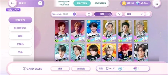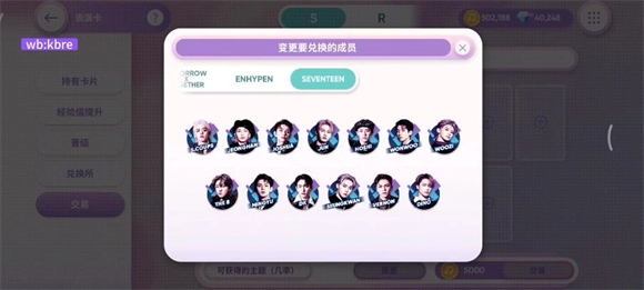 交易卡牌的操作步骤如下:首先在卡牌界面点击左侧的交易按钮,接着点击变更选项,然后选择需要换卡的成员,点击+号进入选卡界面。在选卡界面的顶部,你可以自由切换不同的团体。需要注意的是,所有同等级的卡牌,无论其所属等级如何,都能够作为换卡的材料使用。
