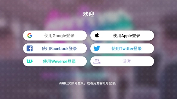 首次进入游戏时需选择登录方式,共有六种选项,包括谷歌账号、苹果账号、脸书账号、Twitter账号、weverse账号和游客登录。初次游玩建议使用游客登录,若后续希望继续游玩,可选择绑定账号。