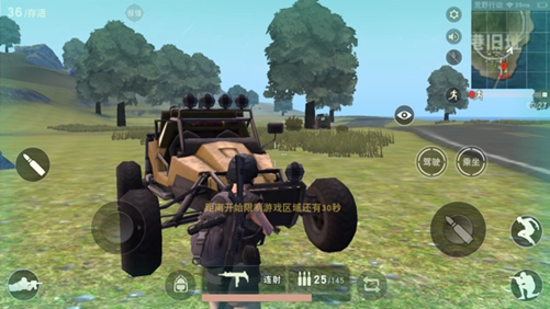 现在荒野行动里的载具分为两类,一类是黄色的,另一类是绿色的。就像图中展示的那样,作者更偏爱绿色的载具,因为这类车带有车顶,能降低被爆头的风险。
