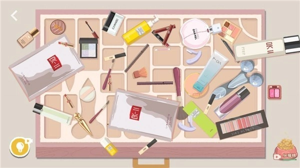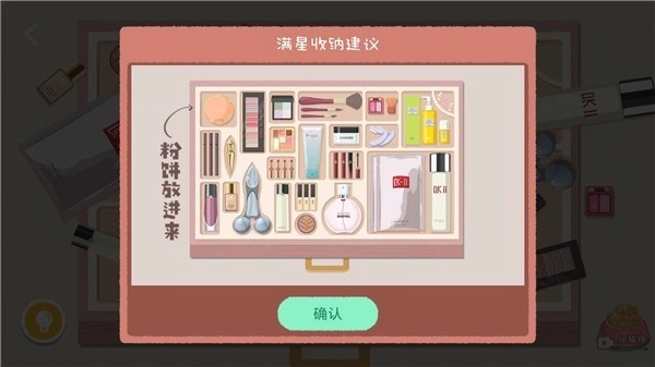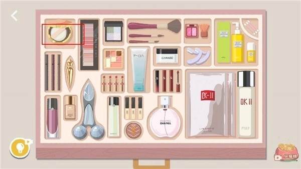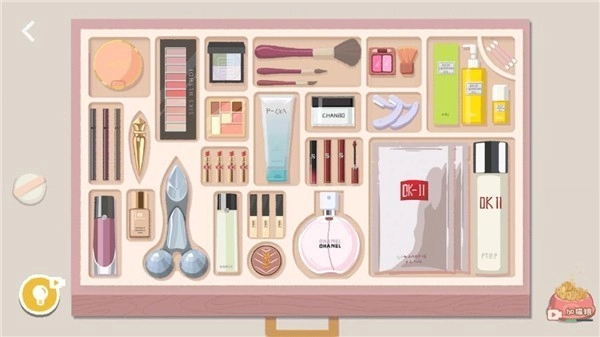 所有化妆品都放好后,剩下的粉扑没地方安置,点击粉饼盒子就能打开它。
