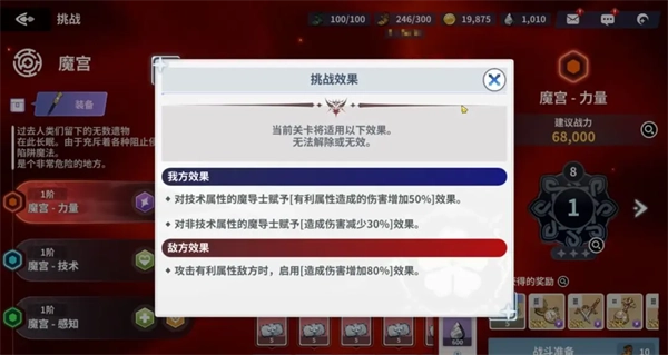 攻略「魔宫」副本的关键在于三者间的相互克制关系:力量克制感知,感知克制技术,技术则克制力量。