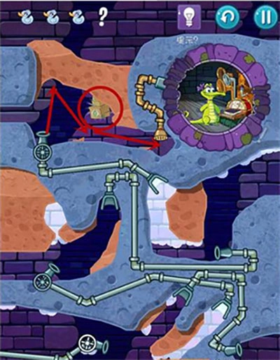 2、本关首先在通向上面一只鸭子处划开道路,打开红色水闸开关。然后泥浆碰见青草变为石头;