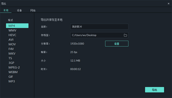 1、要将视频导出到本地,首先单击导出按钮,然后选择“本地选项卡”,选择需要导出的格式。目前万兴喵影支持以下格式:MP4,WMV,HEVC,AVI,MOV,F4V,MKV,TS,3GP,MPG-2,WEBM,GIF和MP3。