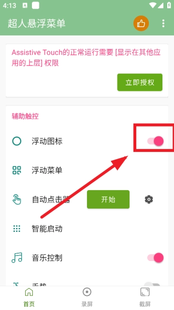 打开超人悬浮菜单软件,点一下首页的开启按钮