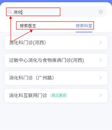 用户也可以直接搜索医生名字或者科室进行预约挂号。