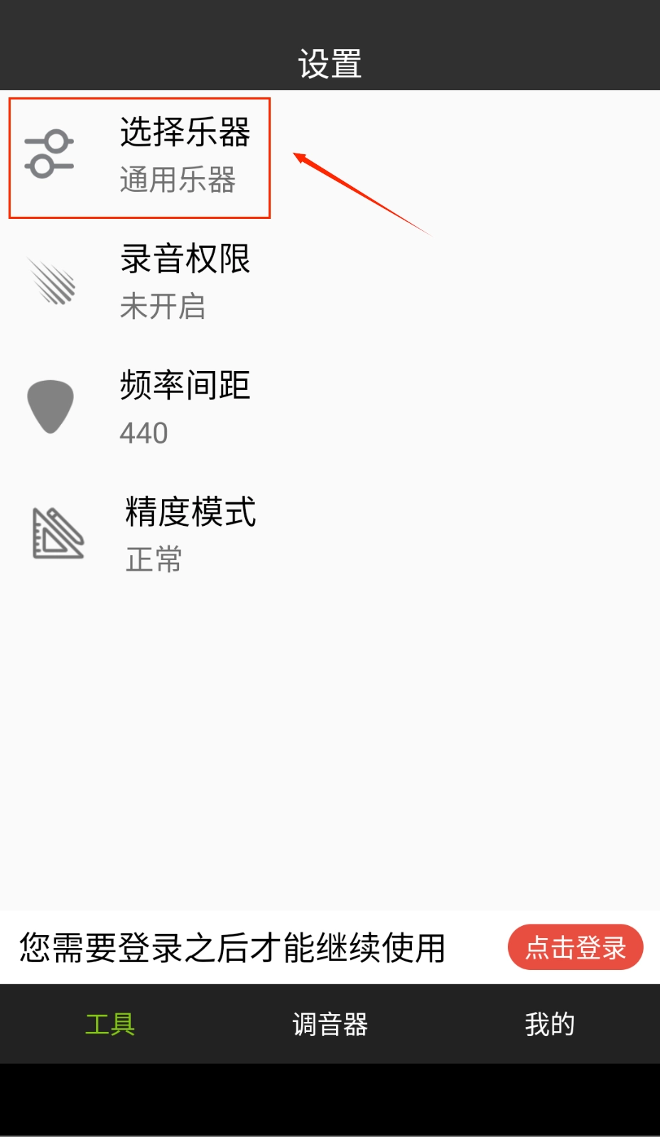 进入小熊调音器的“工具”页面,找到并点击“选择乐器”选项,随后在弹出的列表中选择“吉他”。