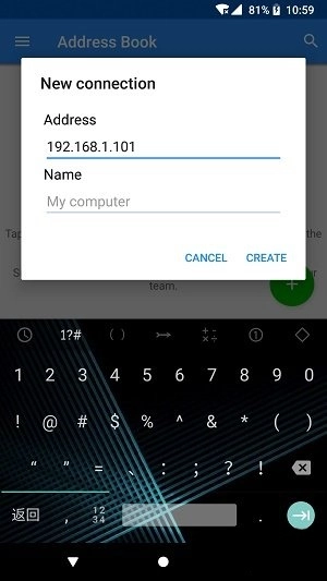 点击软件右下角的“+”按钮,接着在对应的输入框里填写IP地址和远程连接的名称。