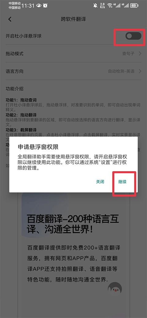 进入后点击开启杜小译悬浮球,此时会弹出悬浮窗权限申请,点击“继续”即可。