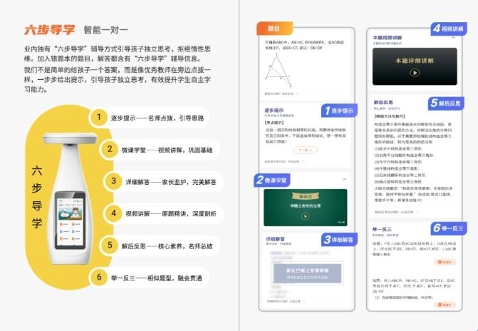 当孩子在习题面前感到困惑时,导学号AI自习室运用其独创的六步导学法,并非直接呈现答案,而是借助逐步引导、微课讲解、解题反思等多种形式,帮助学生自主完成作业。