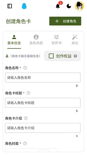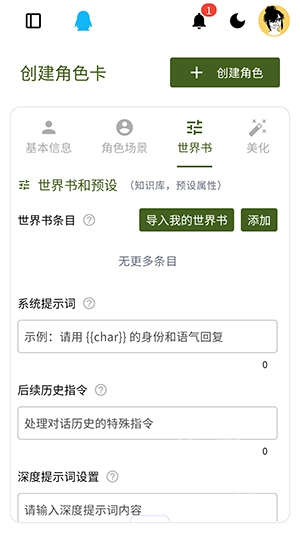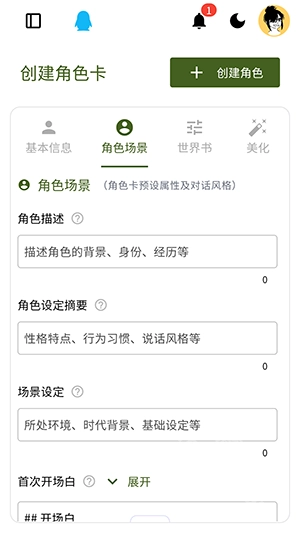 可对角色的描述、设定、所处场景、对话范例、各类消息以及开场白等内容进行调整。