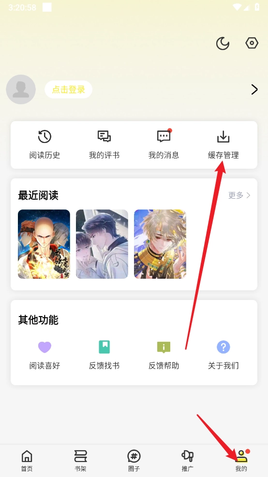 接着进入我的页面,点击"缓存管理"。